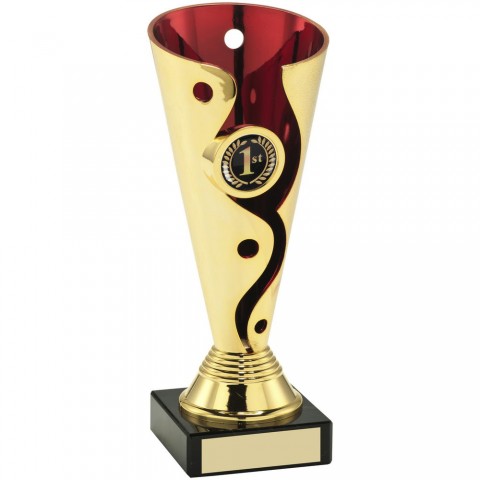 GOLD/RED PLASTIC SWIRL AND DOT TROPHY - (1in CENTRE) 6.75in